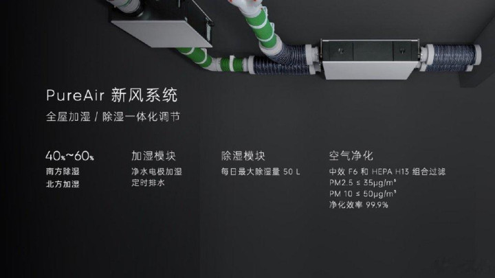 L32的空气管理系统不仅能够实时监控室内的空气质量,还能够通过智能算法自动调节空气中的二氧化碳浓度、PM2.5值以及湿度等指标。尤其是在城市空气污染较为严重的情况下,L32的PureAir新风系统」拥有370m³/h全屋得风量,可以在1小时实现全屋换气1.5次,迅速刷新全屋空气。对于有孩子的家庭来说,L32系统更是具备智能感知功能,能够识别孩子的活动范围,调节适宜的温湿度,营造适合成长的健康环境。